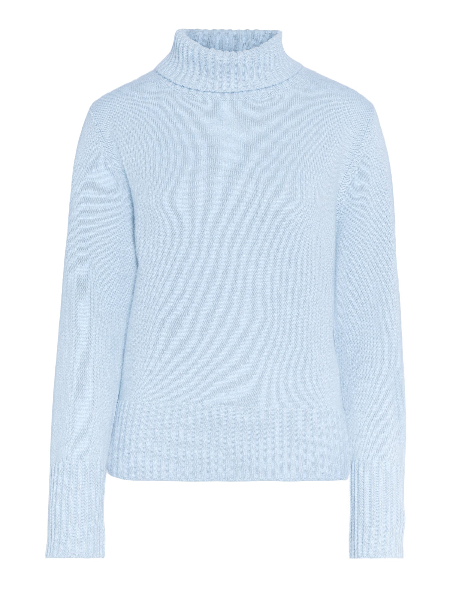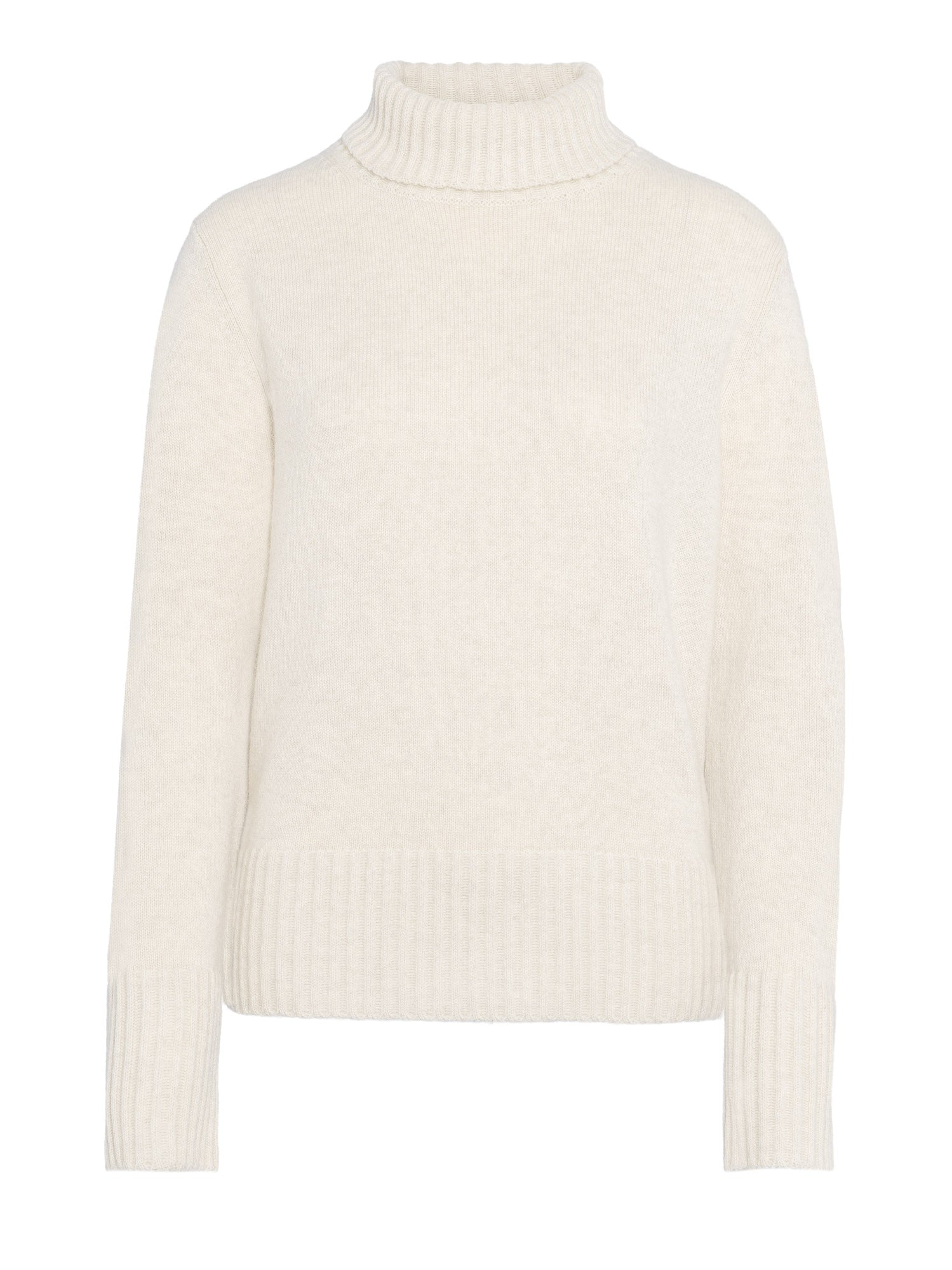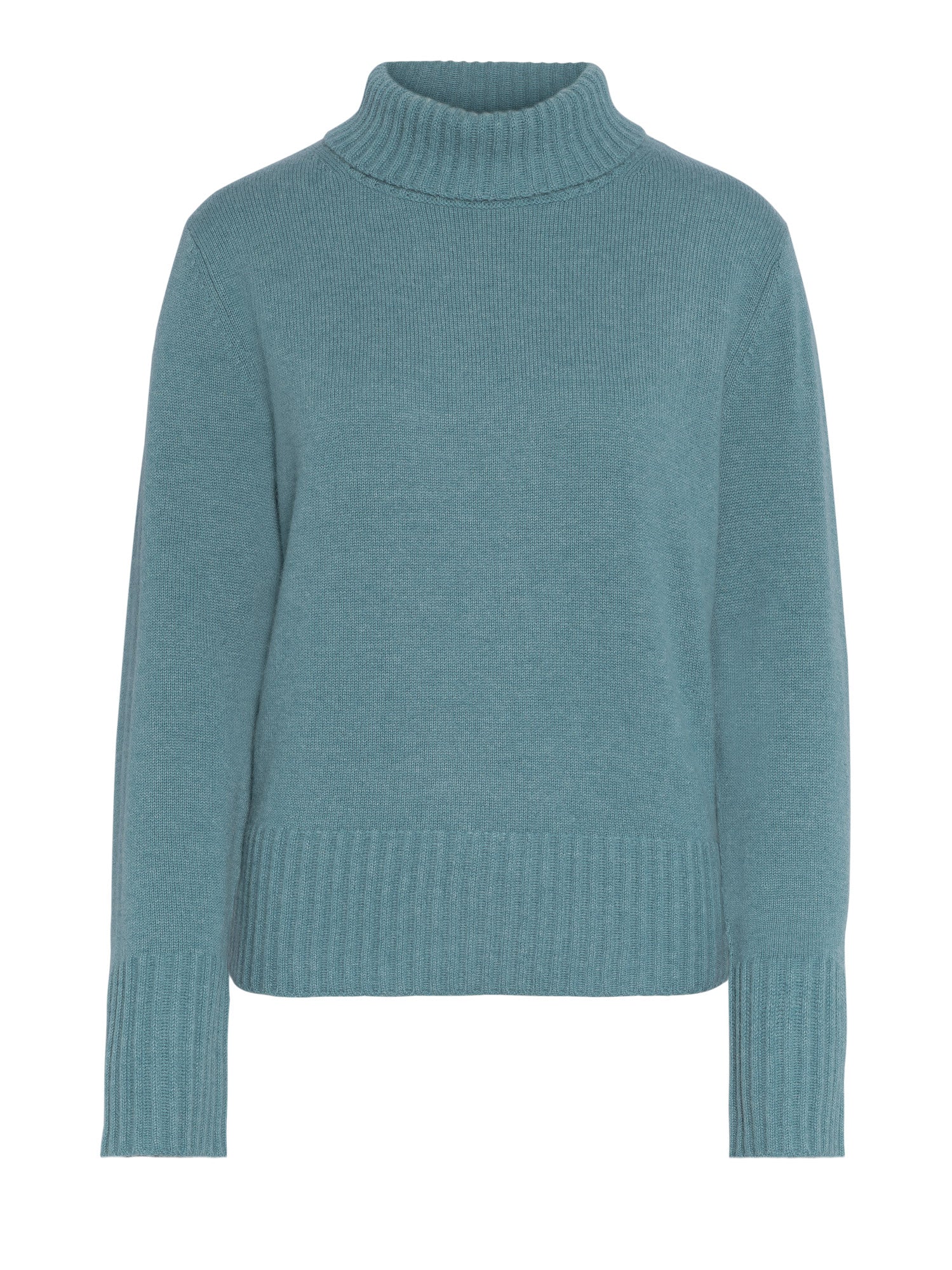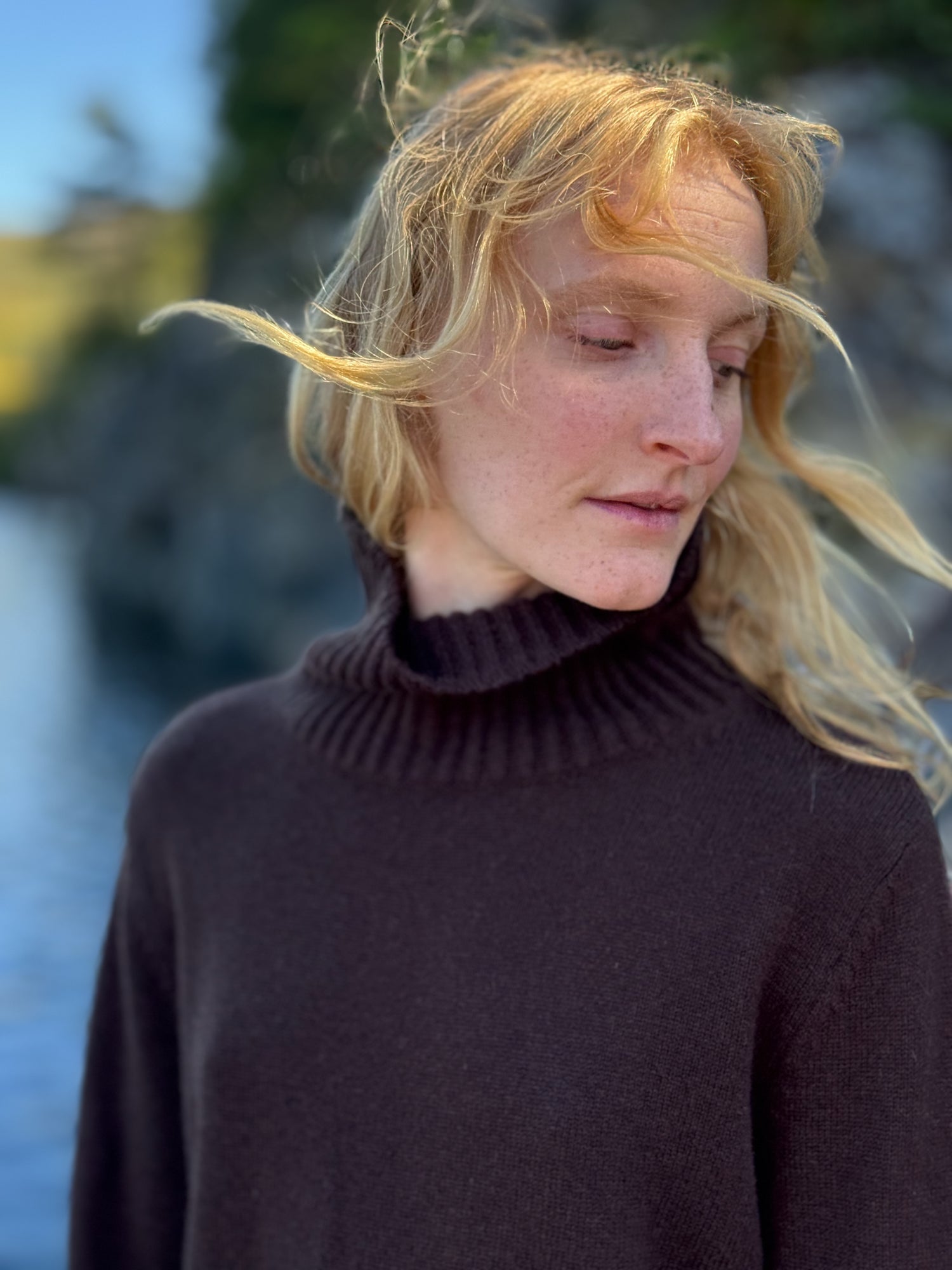 Deep, exquisitely soft Henderson double cashmere™️ with thick, high ribbed neck, cuffs and hem for a rustic yet elegant look. Roomy at the chest, fitted at the waist with high, thick rib. The high neck and cuff ribbing is comfortable and not too tight.
